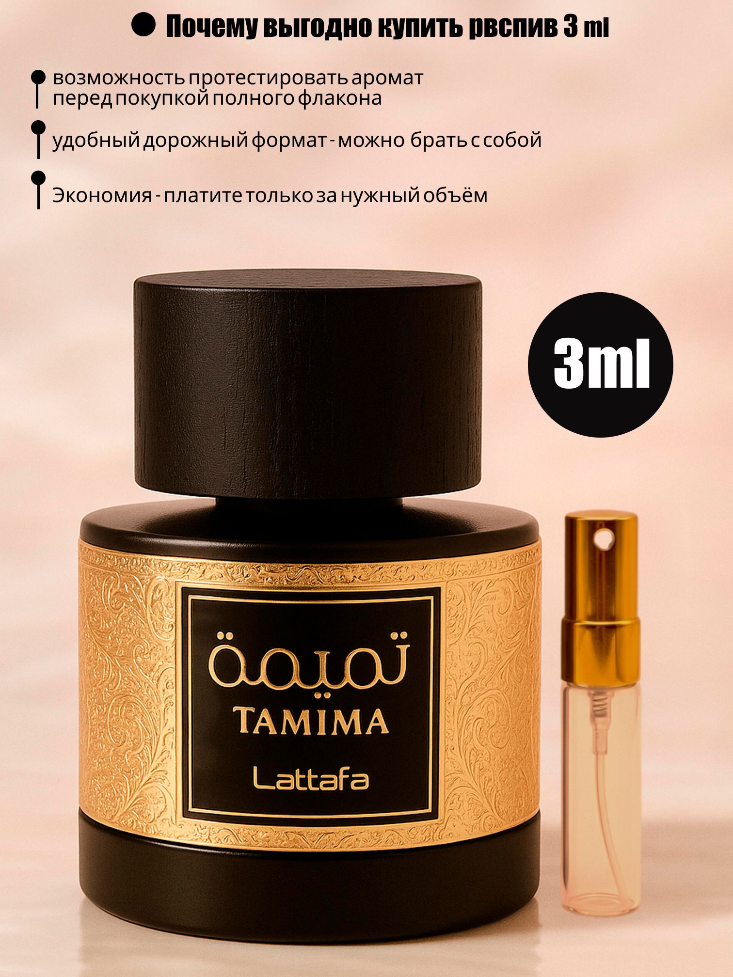 Tamima — это современный фруктово-цветочный аромат, который дарит ощущение чистоты, свежести и ухоженности с первых секунд. Формат распива 3 ml — лучший способ познакомиться с ароматом без переплаты за полный флакон.